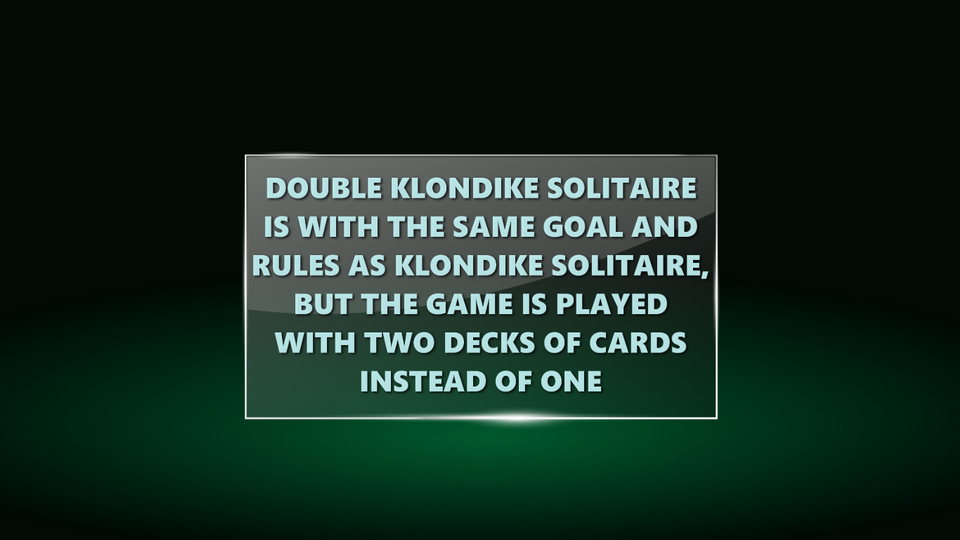Description Double Klondike Solitaire is one of the great classic solitaire games. The rules and goal are the same as classic Klondike Solitaire. The difference is that Double Klondike uses two decks of cards.