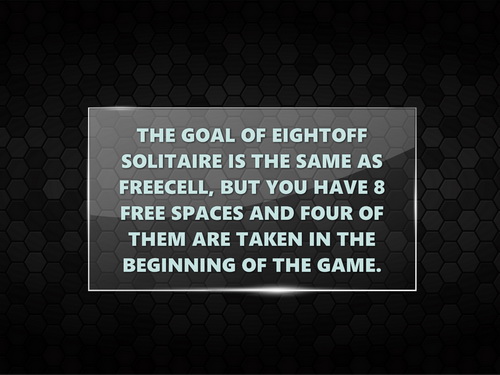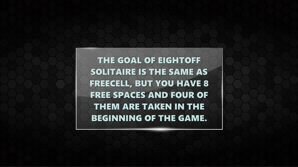 Description Eightoff Solitaire is one of the great classic Solitaire games! The goal of the game is the same as Free Cell Solitaire, but you have 8 free spaces. Four of the free spaces are taken in the beginning of the game.