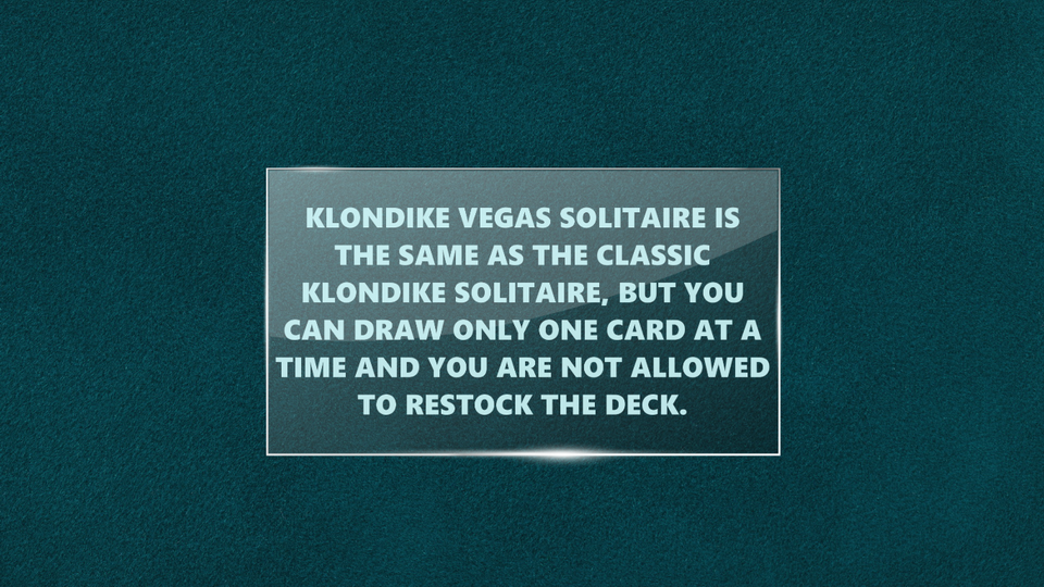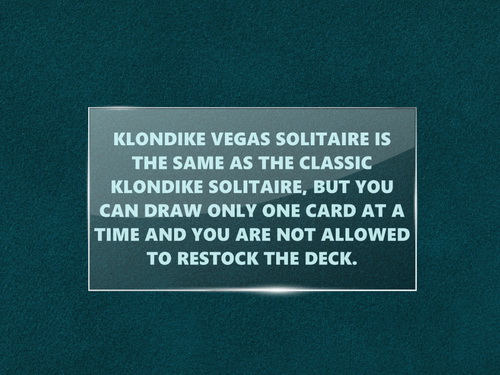 Description Klondike Vegas Solitaire is one of the great classic solitaire games. The game is the same as the classic Klondike Solitaire, but you can draw only one card at a time and the deck can not be restocked again.